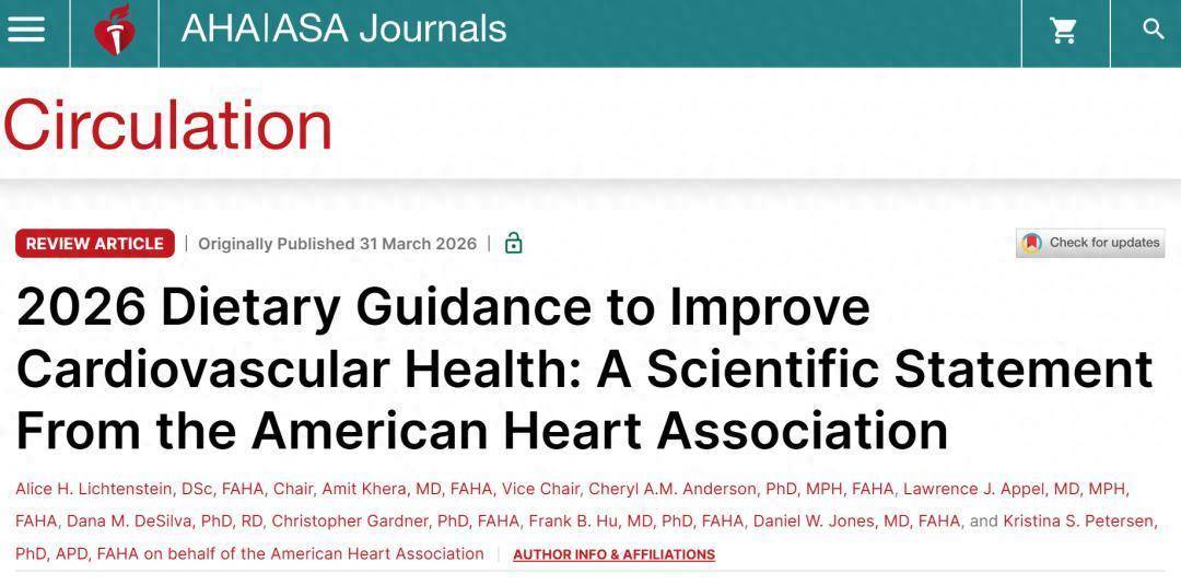 ①Lichtenstein AH, Khera A, Anderson CAM, et al. 2026 Dietary Guidance to Improve Cardiovascular Health: A Scientific Statement From the American Heart Association. Circulation. Published online March 31, 2026. doi:10.1161/CIR.0000000000001435